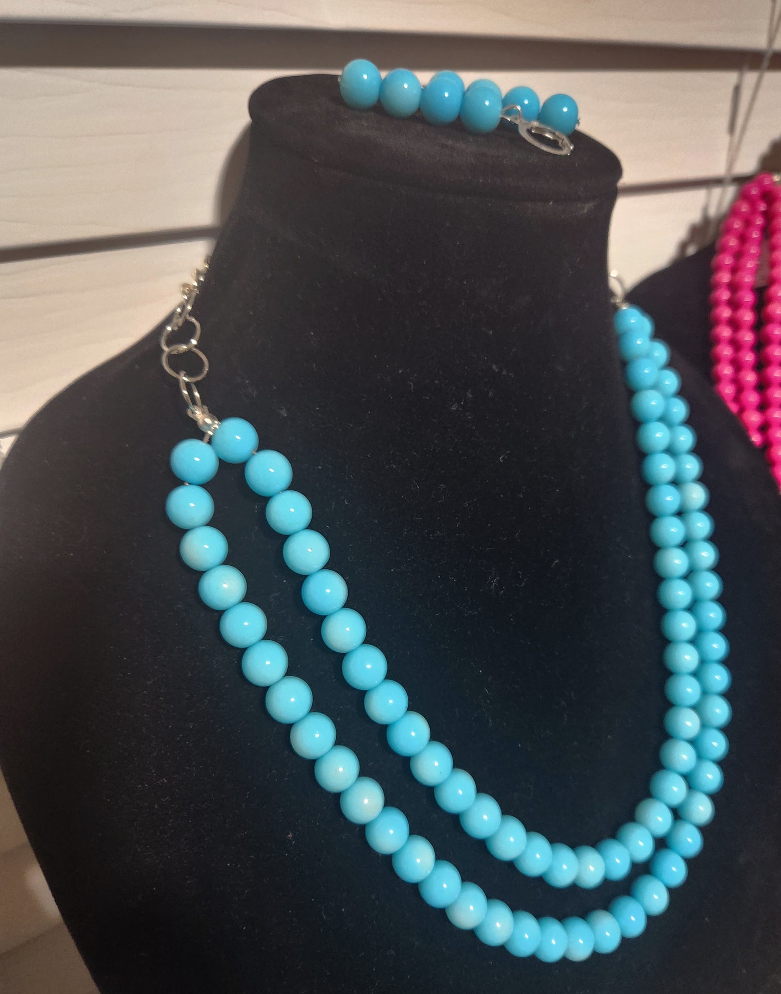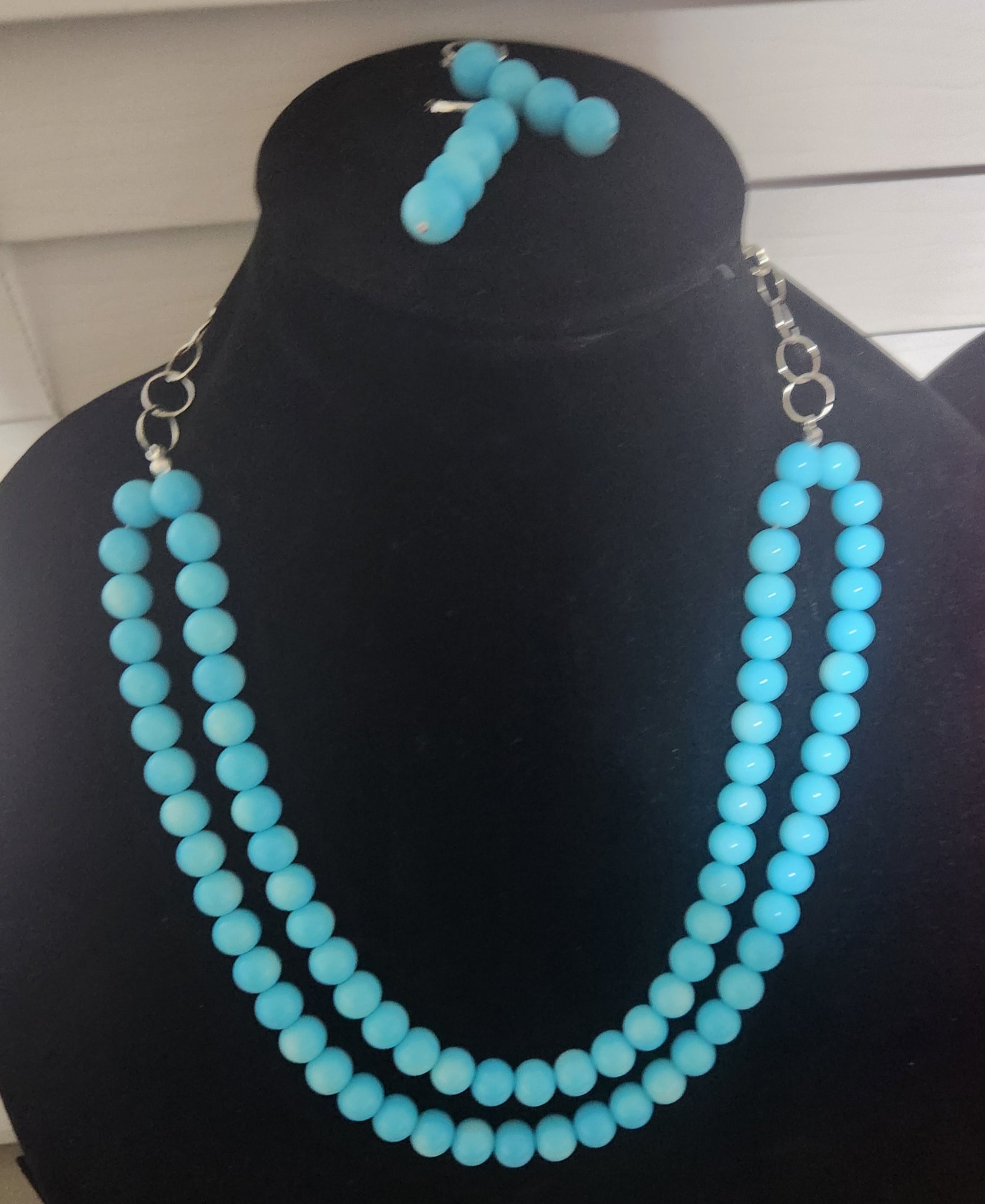 Embrace understated luxury with this striking turquoise blue jewelry collection. Meticulously composed of a two-strand necklace featuring premium glass beads at 22 inches, complemented by elegantly proportioned drop earrings measuring 2 inches, this set embodies refined taste. Every element has been thoughtfully selected to create a cohesive, distinctive look that transcends fleeting trends. Perfect for those who understand that true elegance emerges from the careful consideration of each component, this ensemble offers timeless sophistication for the discerning wearer.