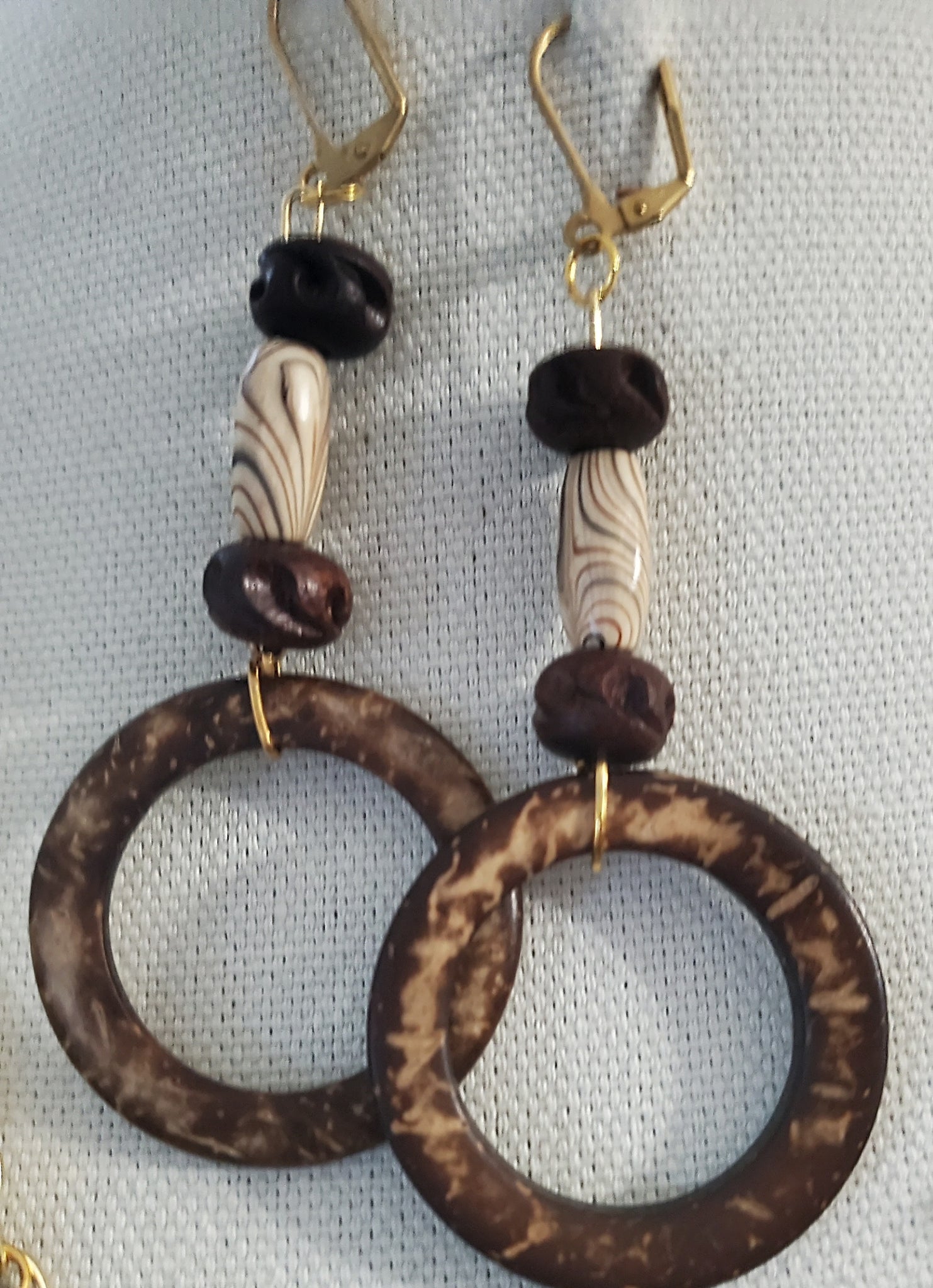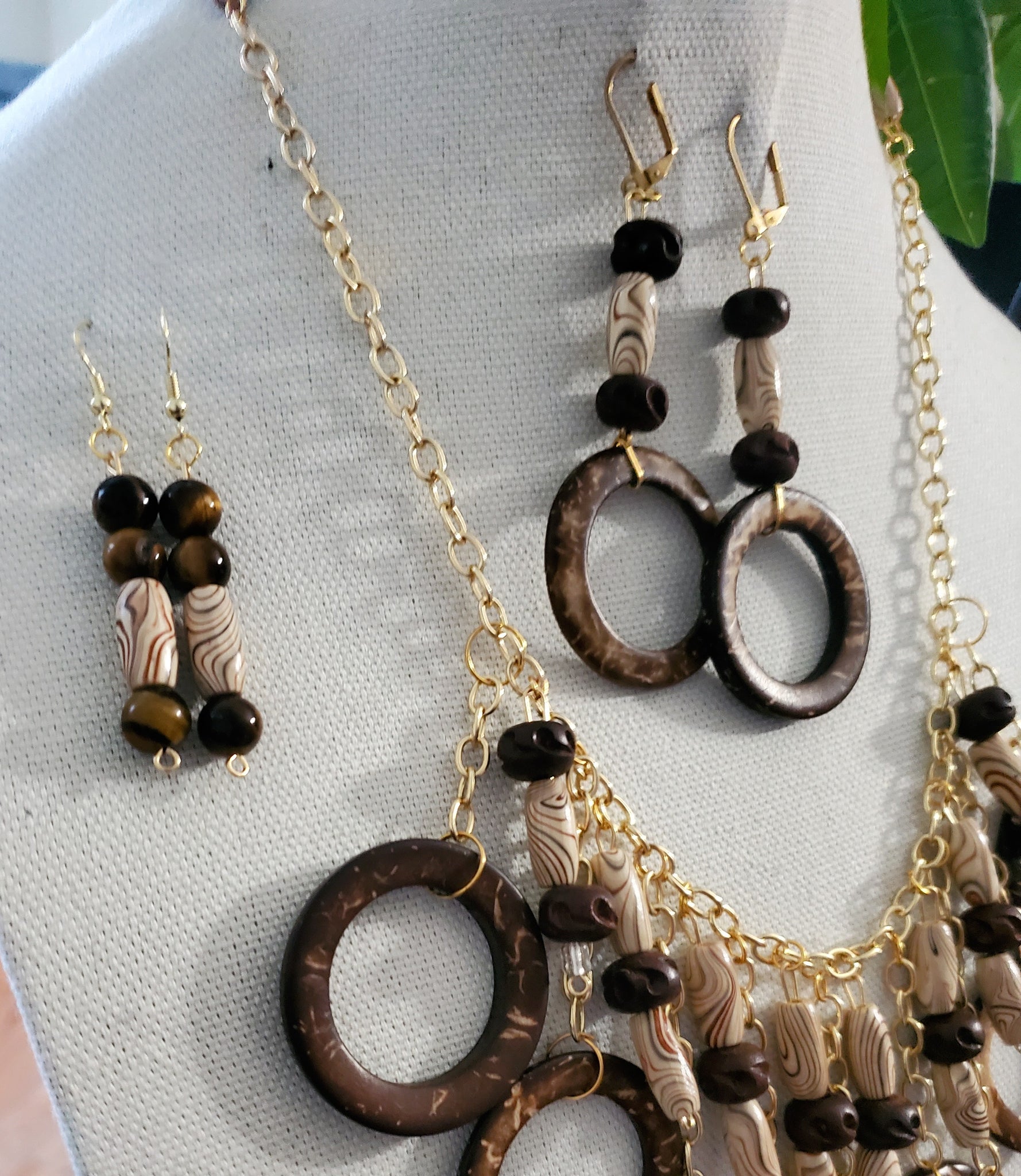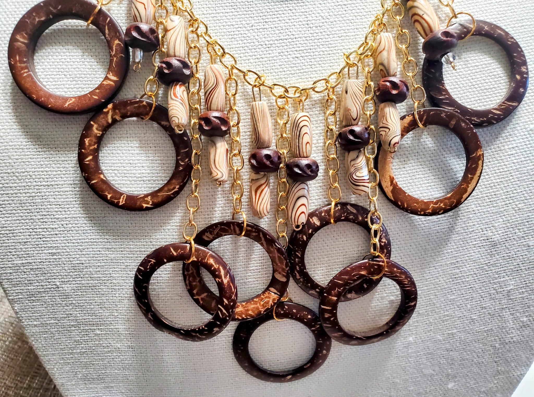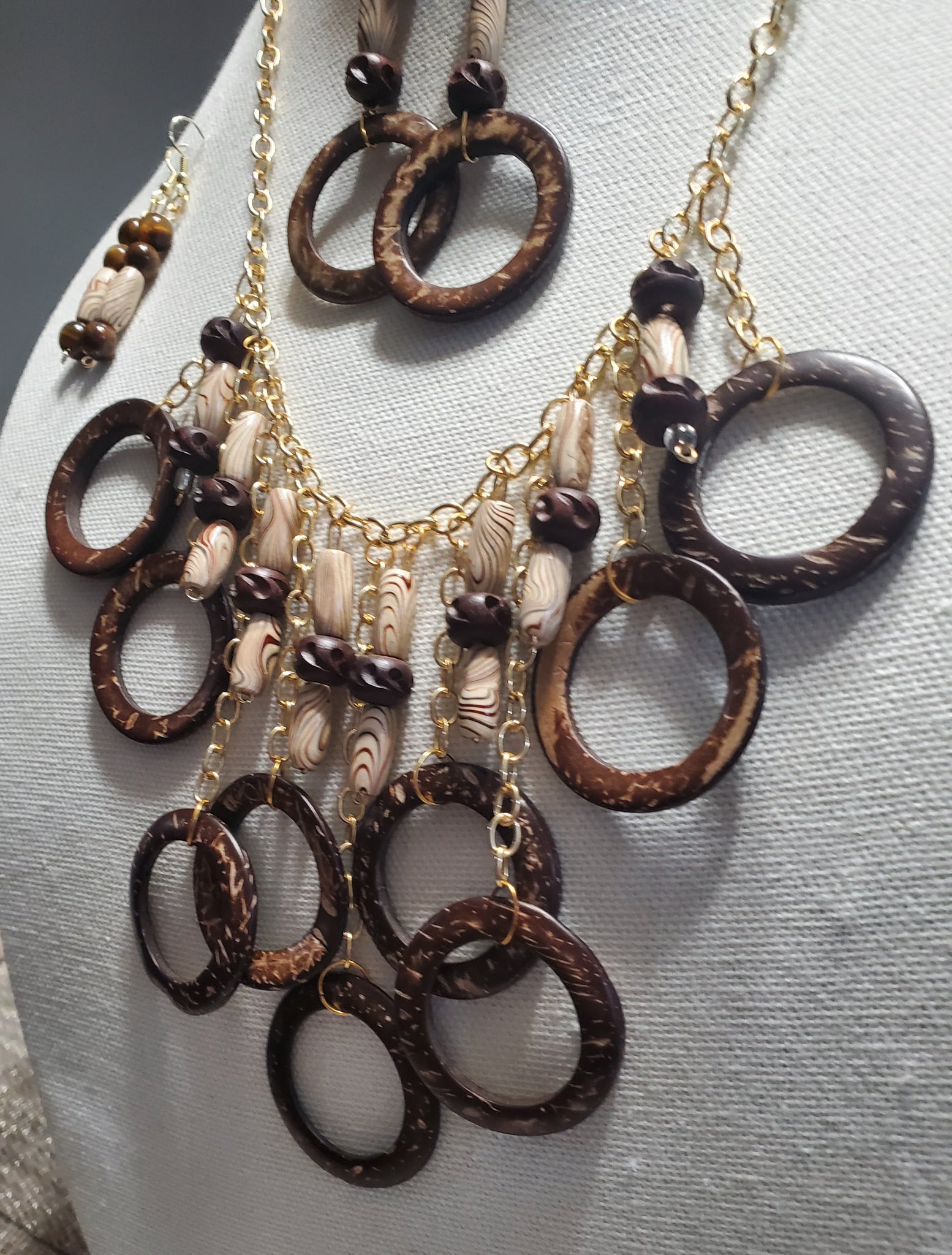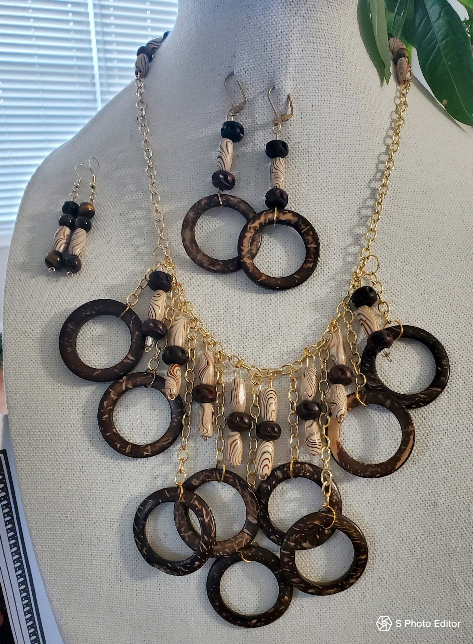 An artistic flow of beautiful, wooden, circles, cylinders and discs merge together to create this magnificent and sexy necklace and earring ensemble. Wear her with confidence and walk your walk like you own the world!
